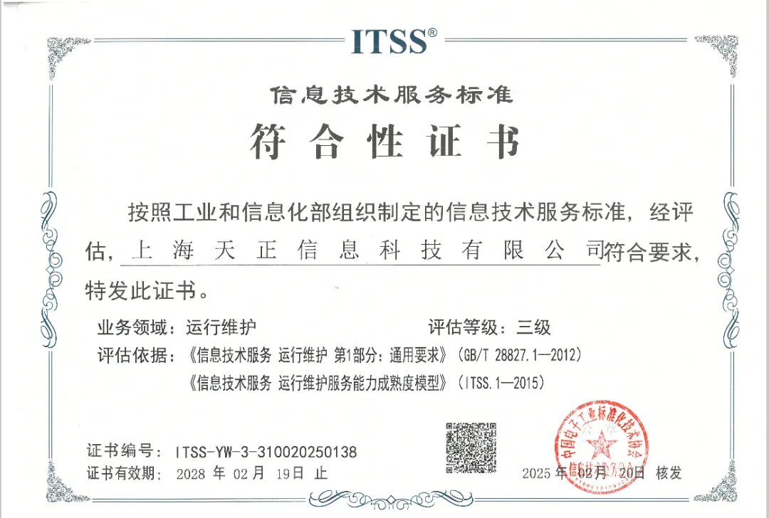 喜報!熱烈慶祝天正信息成功通過ITSS三級認證,邁向服務(wù)新高度!